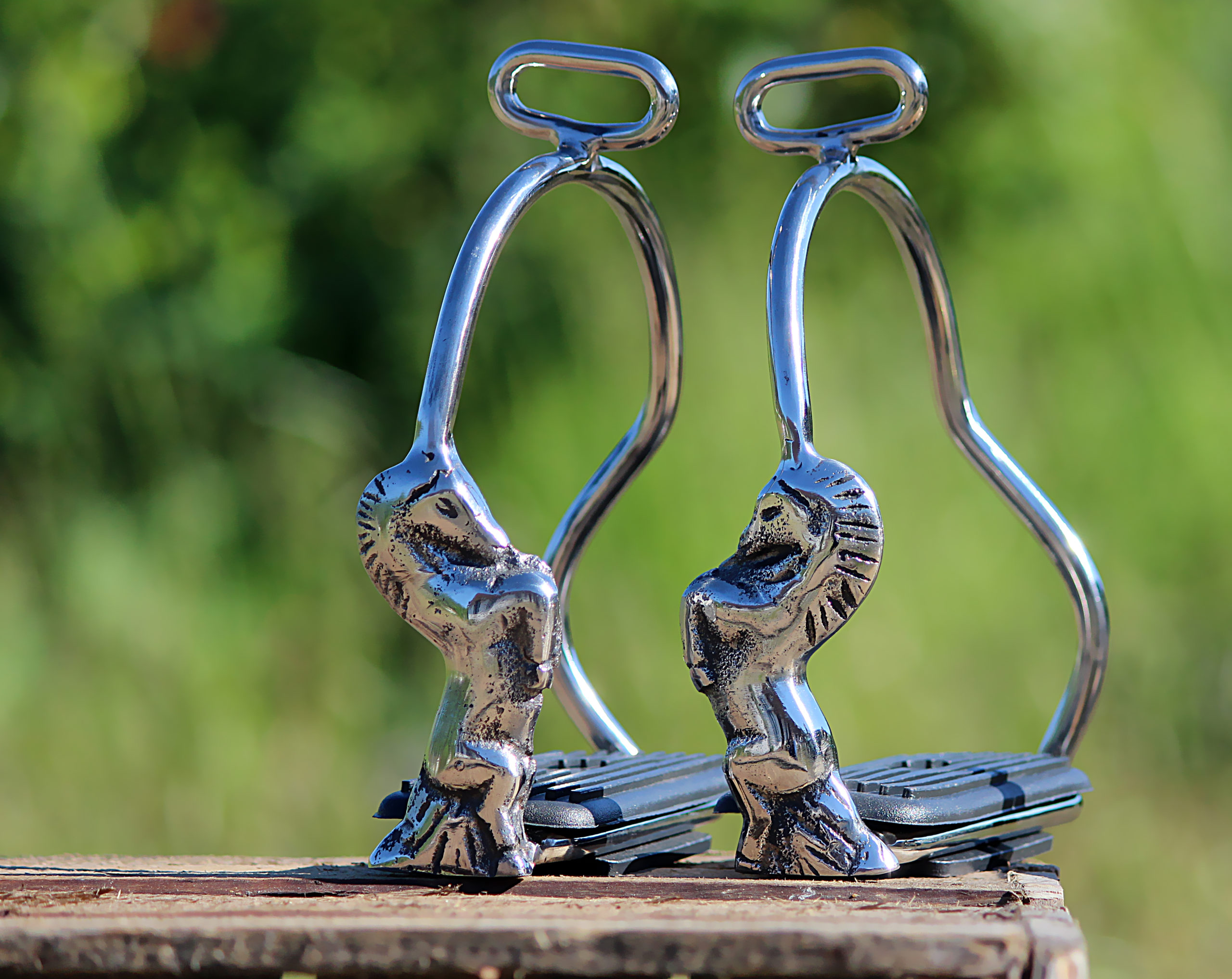 Stigbøjler i stål med hestemotiv