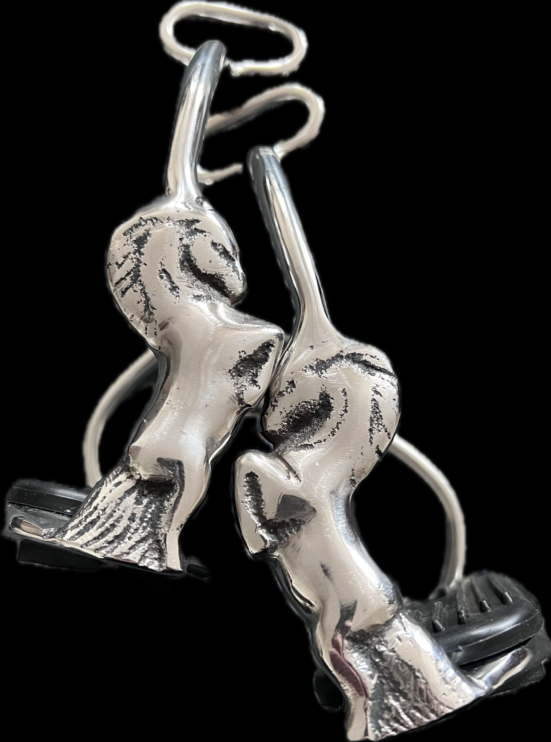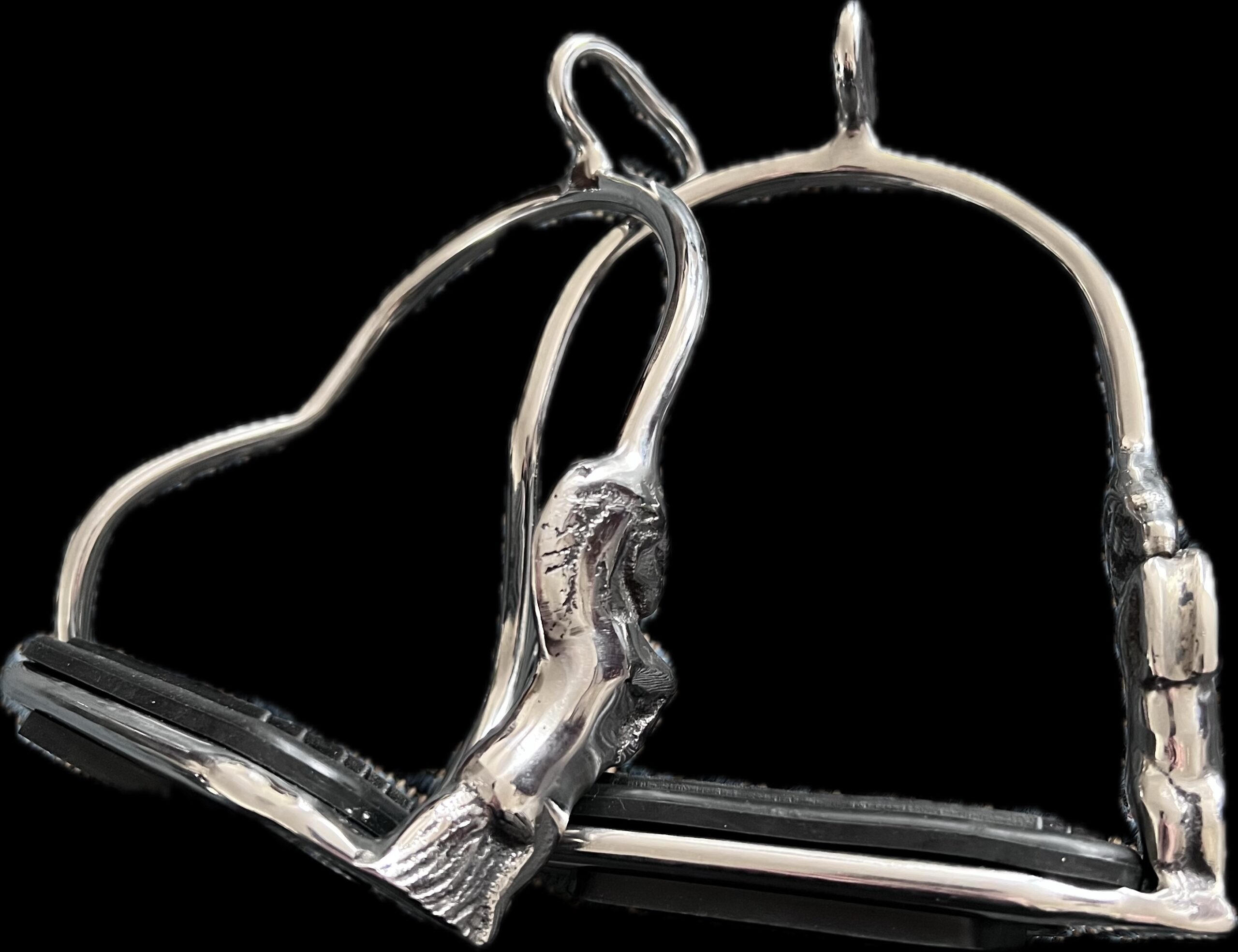 Elegante stigbøjler i stål med hesteudsmykning på ydersiden af hver stigbøjle.
