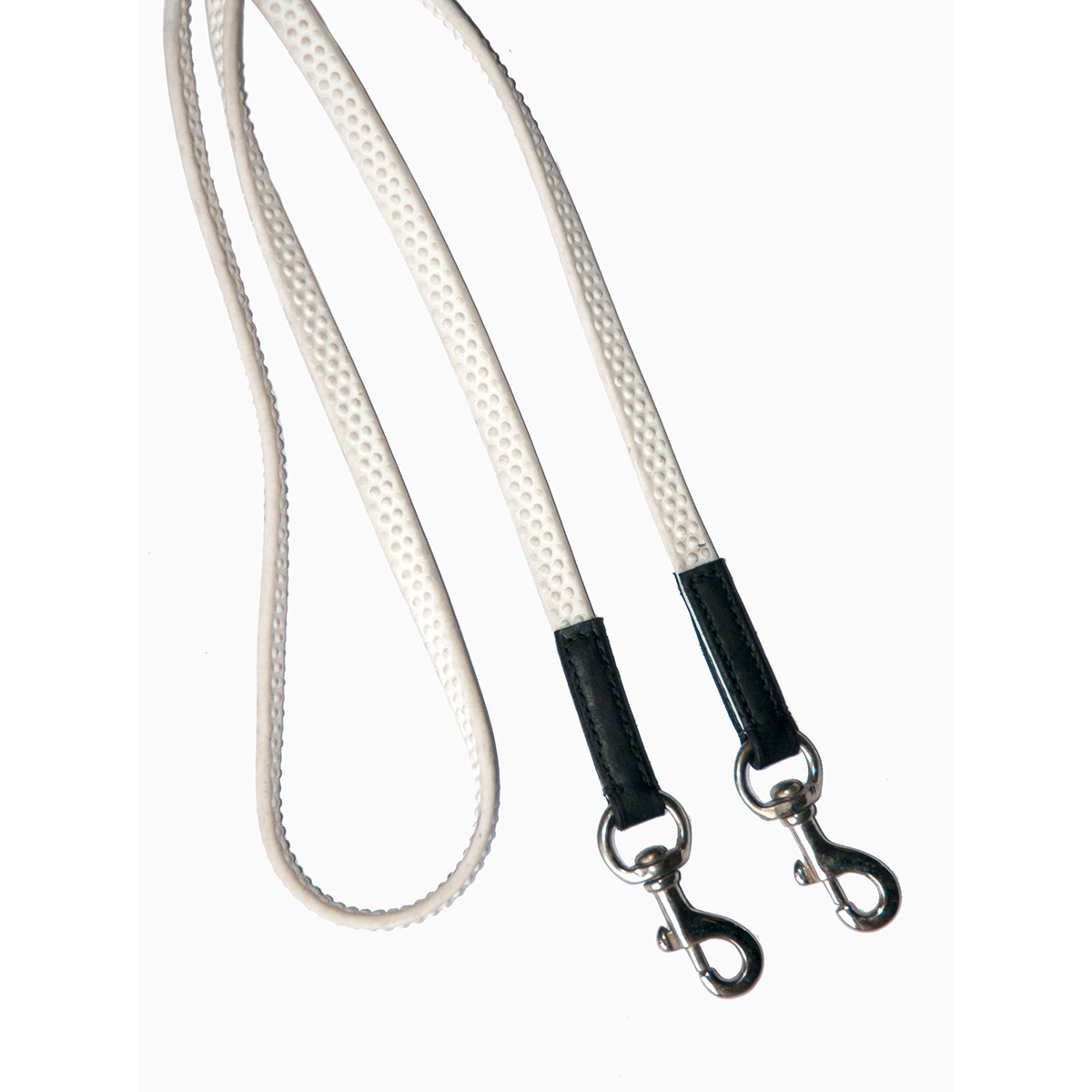 Hvide biothane tøjler med dupper fra Hestagallery. Tøjlerne har en længde på 2,50 meter.